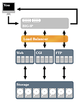 Site data is parsed by our load balancers and is then managed by our high quality servers, which are split into application pools (Web, FTP, incoming mail, etc.). This type of architecture allows us to customize each machine to the service it performs, which means more density per box, and ultimately, faster and more reliable services. No pool lives entirely on one rack. Therefore, even the loss of a rack's switch or its power will not take that service pool down.